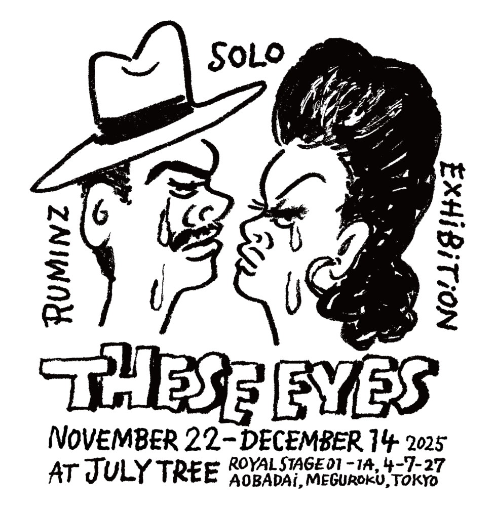 ‘60年代前後のリズム&ブルース、ソウル、スカやロックステディ、チカーノソウルなど様々な音楽やその周辺のカルチャーから影響を受け、その過剰なオブセッションを原動力に作品を作り続ける広島在住アーティスト、RUMINZ ( ルミンズ ) による東京では約2年半ぶりの個展RUMINZ SOLO EXHIBITION “THESE EYES “を開催いたします。