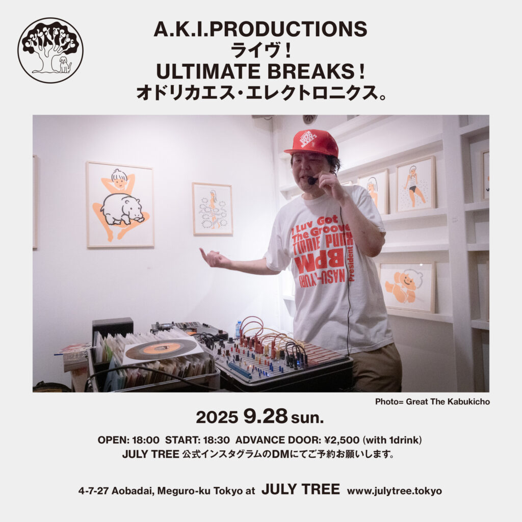 坂本慎太郎がロゴを手掛ける神泉の小さなギャラリーJULY TREEにてジャパニーズ・ヒップホップ黎明期よりラッパーとしてマイクを握り、アーティスト/文筆家として知られるA.K.I.によるA.K.I.PRODUCTIONSのライヴを開催します。