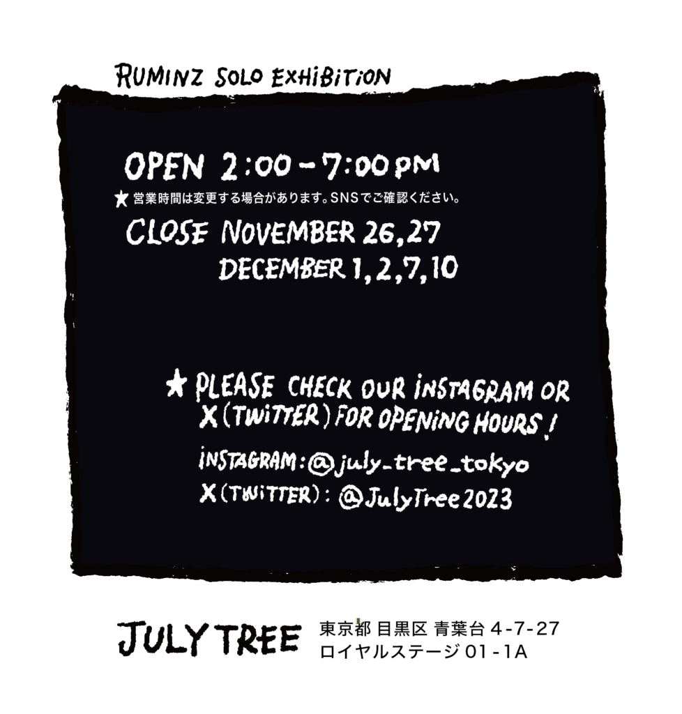 ☆営業時間は変更となる場合がございます。お問い合わせ、ご確認についてはJULY TREE 公式Instagramにてお願いいたします。